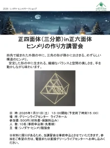 | 内容 | 四角で組まれた外側の中に、三角の形が静かにおさまる、めずらしい構造のヒンメリ。安定した形の中に生まれる、繊細なバランスと空間の美しさを、手を動かしながら味わいます。 |