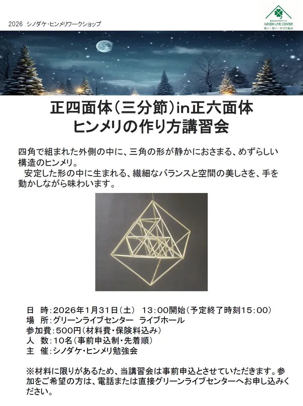| 備考 | 材料に限りがあるため、当講習会は事前申込とさせていただきます。参加をご希望の方は、電話または直接グリーンライブセンターへお申し込みください。 |
